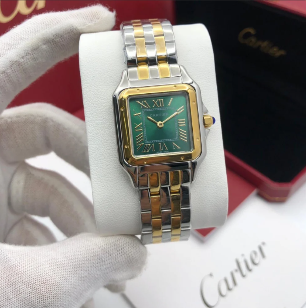 - ساعة كارتير مربعه بتصميم أنيق وفاخر بإطار ذهبي وميناء أخضر ، مما يمنحها مظهرًا أنيقًا وأنثويًا.